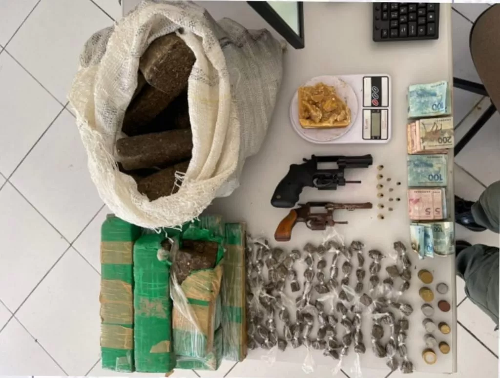 Com o acusado, foi encontrado 403g de crack, 103 bigs de maconha, 19.655g de maconha prensada, 11g de cocaína, bem como balança de precisão, dois revólveres sendo um calibre 38 com seis munições intactas do mesmo calibre, outro de calibre 22 com seis munições do mesmo calibre estando quatro intactas e duas deflagradas, que estava no muro da residência, e a importância de R$ 7.524,90 (sete mil, quinhentos e vinte e quatro reais e noventa centavos).