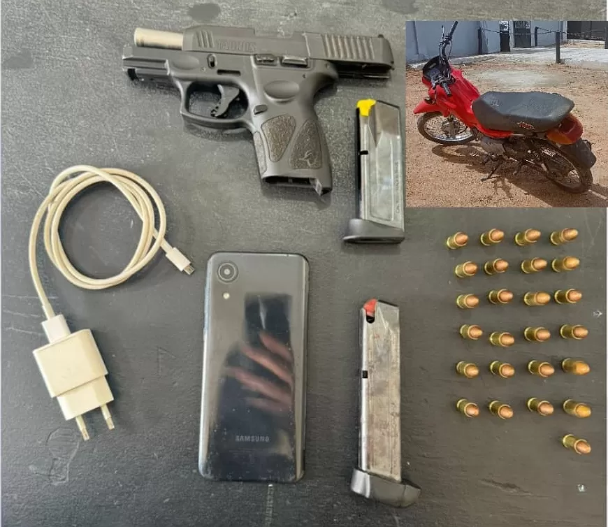 Jaildo Santos Oliveira, não reagiu à prisão, com ele as equipes encontraram uma pistola calibre 9mm, munições, um carregador de pistola calibre 380, um aparelho celular e uma moto com o chassi adulterado.