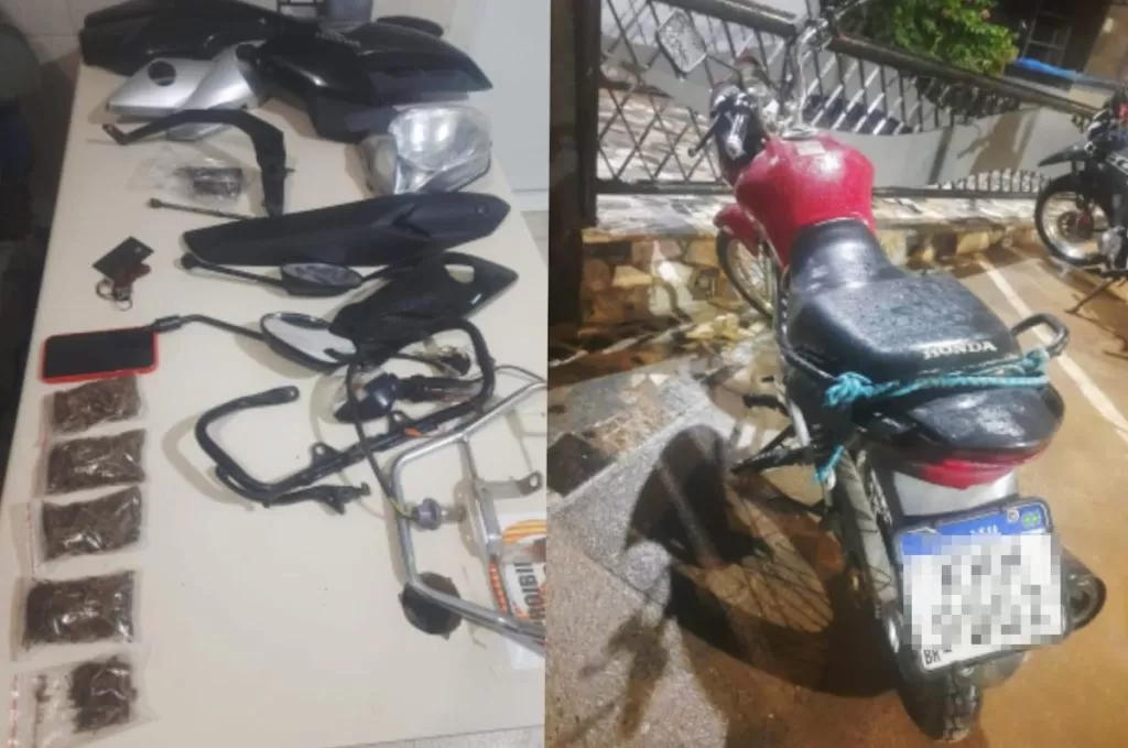 A polícia militar apreendeu drogas, peças de moto e uma motocicleta roubada em uma residência na Rua Maria das Dores, no bairro Feliciano, em Belo Jardim, no final da tarde de terça-feira, dia 16. Dois suspeitos foram presos em flagrante e levados à delegacia de polícia.