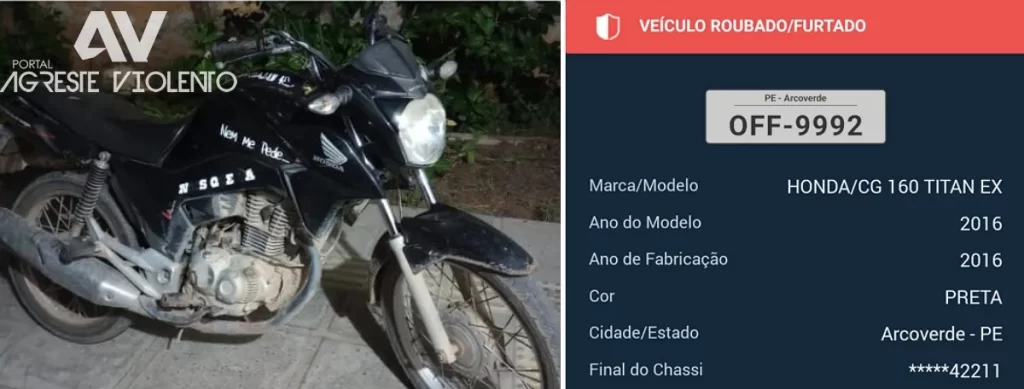 A motocicleta apreendida com tem registro no município de Arcoverde e possui placa OFF-9992, modelo CG 160 Titan na cor preta.