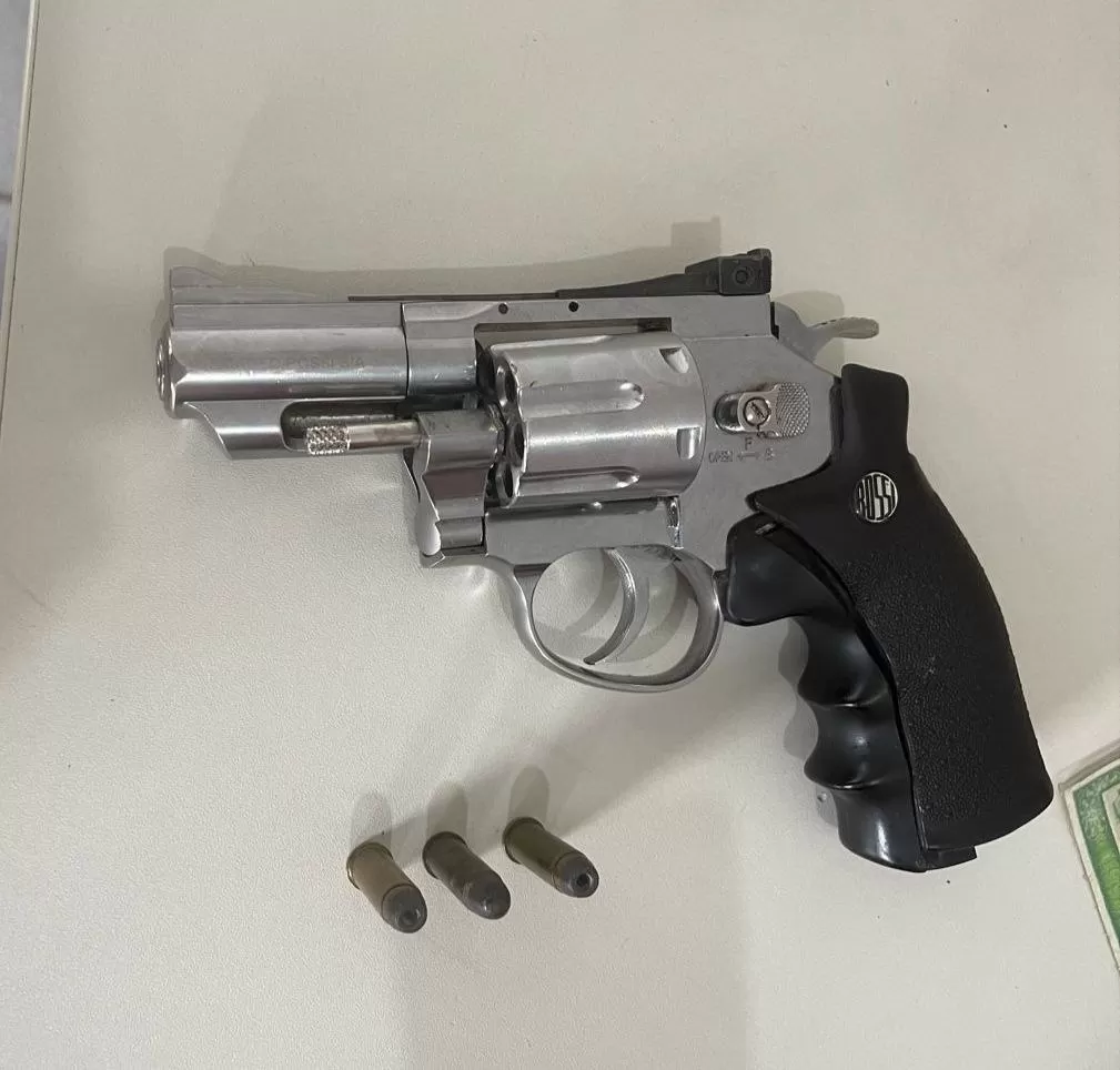 Uma pessoa responsável pelo adolescente autorizou o efetivo adentrar à residência da família, onde após buscas foi encontrado o simulacro de revólver e 3 munições calibre de 38.