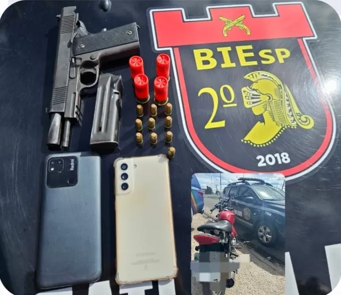 O mesmo foi conduzido para Delegacia de Plantão, juntamente com o material apreendido: uma pistola calibre .40, dez munições de mesmo calibre intactas, quatro munições calibre 12 intactas, uma motocicleta e dois aparelhos celulares.
