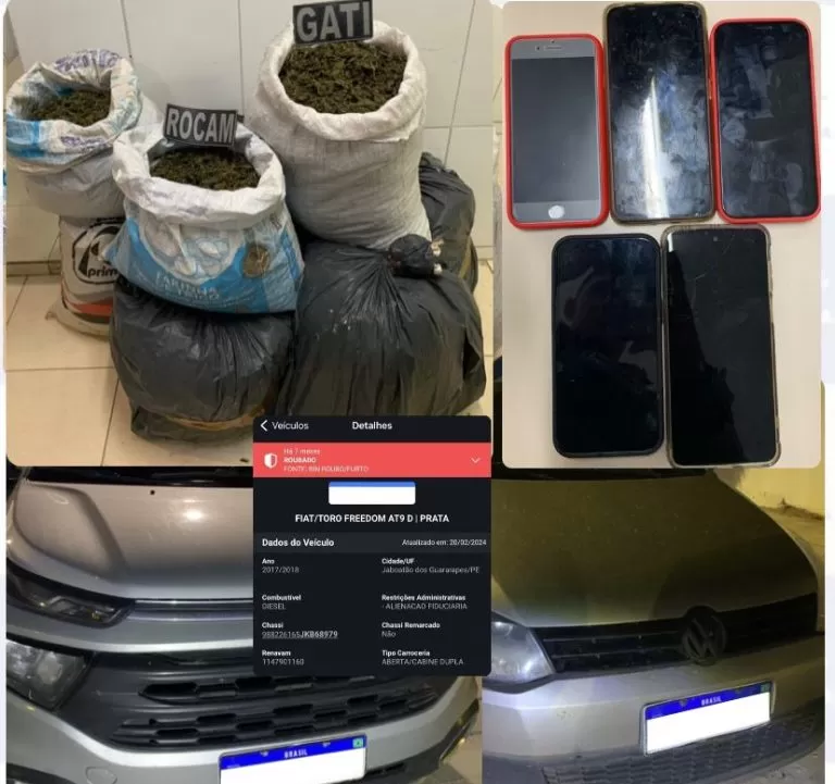 Foi constatado que o Fiat Toro possuía restrição de roubo. Diante de todos os fatos, os envolvidos e as drogas apreendidas foram entregues na Delegacia de Cabrobó, para a adoção das medidas legais cabíveis.