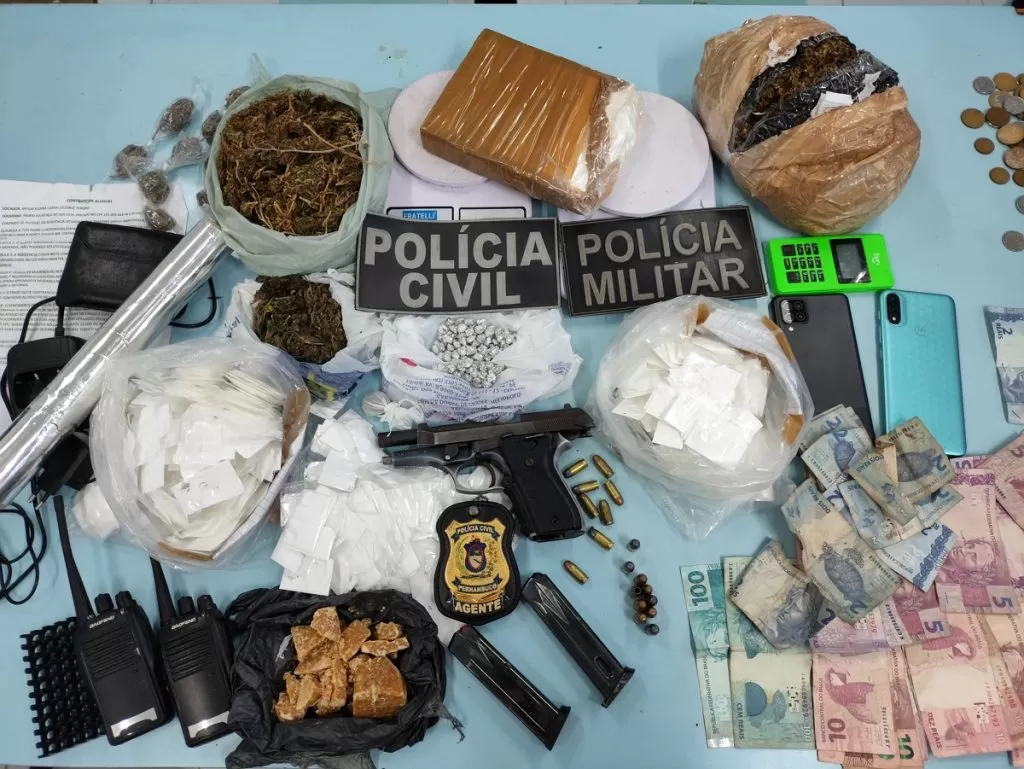 Os itens apreendidos incluíam uma pistola calibre 380 com carregadores e munições, rádios comunicadores, celulares, facas, balanças de precisão, uma maquineta de cartão, entre outros.