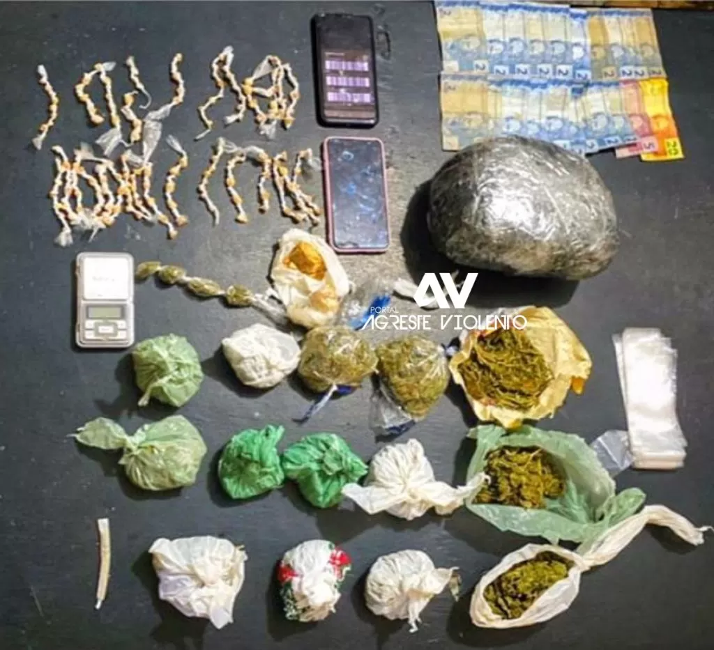 Durante a abordagem, os policiais encontraram com a dupla uma quantidade significativa de substâncias ilícitas e materiais relacionados ao comércio ilegal de drogas. Entre os itens apreendidos estão 151 pedras de crack embaladas, cinco embalagens maiores de maconha, além de porções menores totalizando 25g da mesma droga. Um pacote contendo 1kg de maconha também foi encontrado, junto com 60g de crack em pedras maiores.