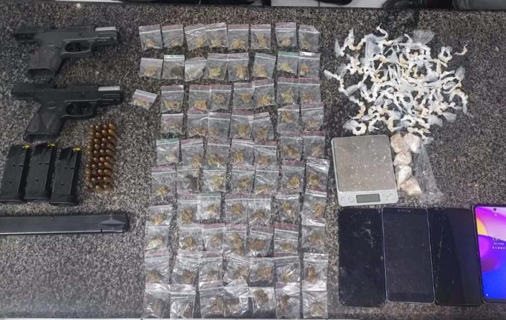 Com eles, foram apreendidos quatro celulares, duas pistolas calibre 9mm com 40 munições, um carregador alongado, 73 big bigs de maconha, 240 pedras de crack e outras cinco pedras maiores da mesma droga e uma balança de precisão.