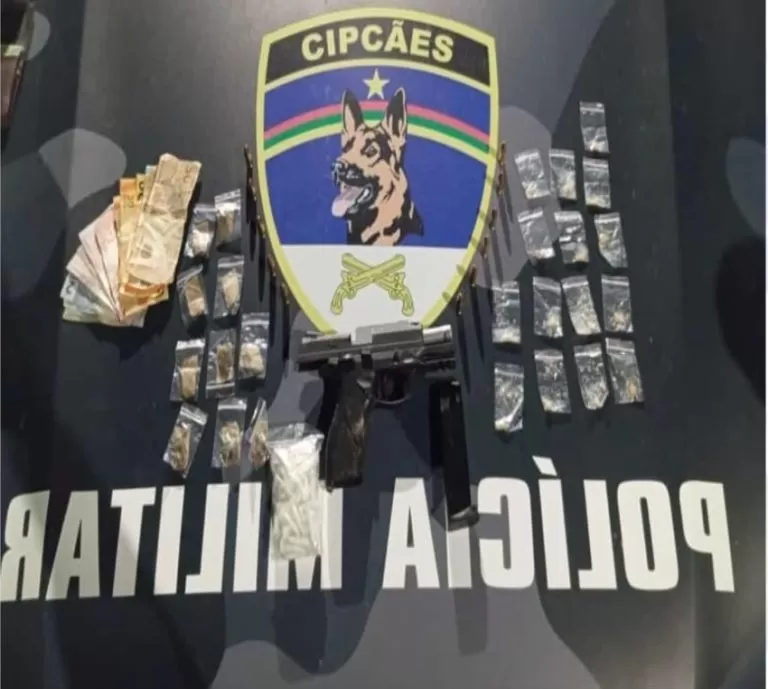 Ao notar a chegada do policiamento, eles tentaram fugir, mas foram alcançados. Na busca pessoal realizada, foram encontrados com o primeiro suspeito dez porções de maconha e 16 de crack, 51 pinos de cocaína e R$ 229.90 em espécie. Com o segundo, havia uma pistola calibre 9mm com 11 munições.