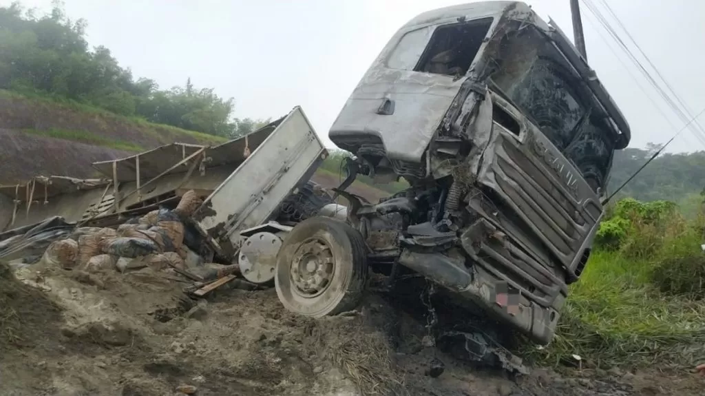 De acordo com os vestígios encontrados no local, uma carreta, carregada com cimento, colidiu na traseira de um caminhão baú, provocando o tombamento completo da carreta sobre a via. Com o impacto o caminhão baú saiu da pista, mas felizmente seu condutor não sofreu ferimentos.