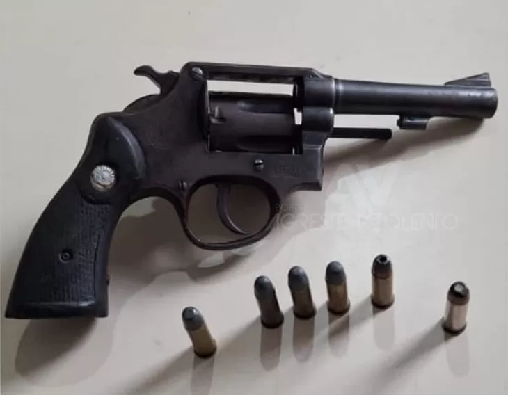 Após uma revista no local, os policiais encontraram um Revólver Calibre 38 com cinco munições intactas no tambor, além de uma munição do mesmo calibre no bolso de Djalma.
