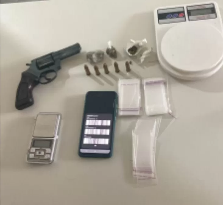 Durante a busca no interior do imóvel, os policiais encontraram duas porções de maconha, plásticos utilizados para embalagem da droga e um revólver calibre 38 municiado com cinco cartuchos intactos, que estava sobre a cama.