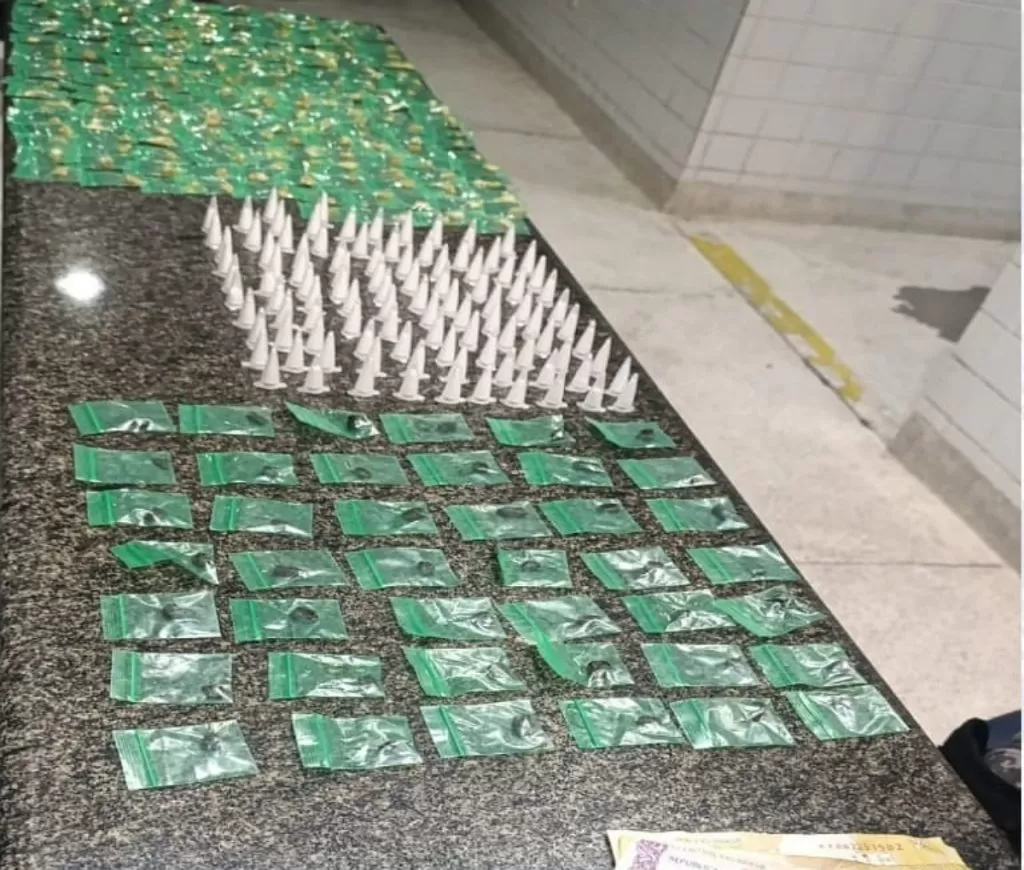 Durante patrulhamento no bairro, o efetivo abordou o suspeito e, com ele, foram apreendidos 184 pedras de crack, 42 invólucros de haxixe, 102 pinos de cocaína e R$ 52,00 em espécie.