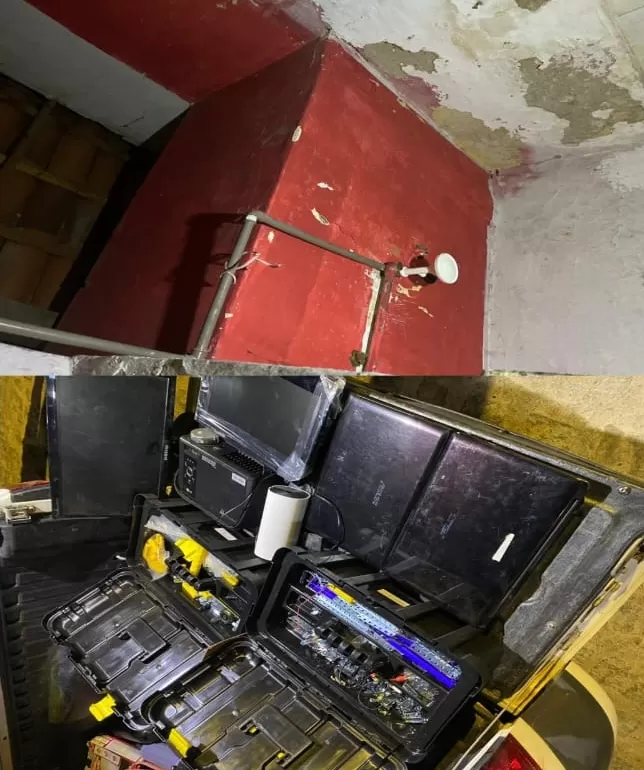 Ao avistá-los fora da residência, foi realizada a abordagem e eles negaram participação no crime, franqueando a entrada do efetivo. A princípio, nada de ilícito foi encontrado. No entanto, ao verificar o banheiro, foi localizado um fundo falso, por trás de uma caixa d’água, onde estavam os objetos subtraídos do órgão público.