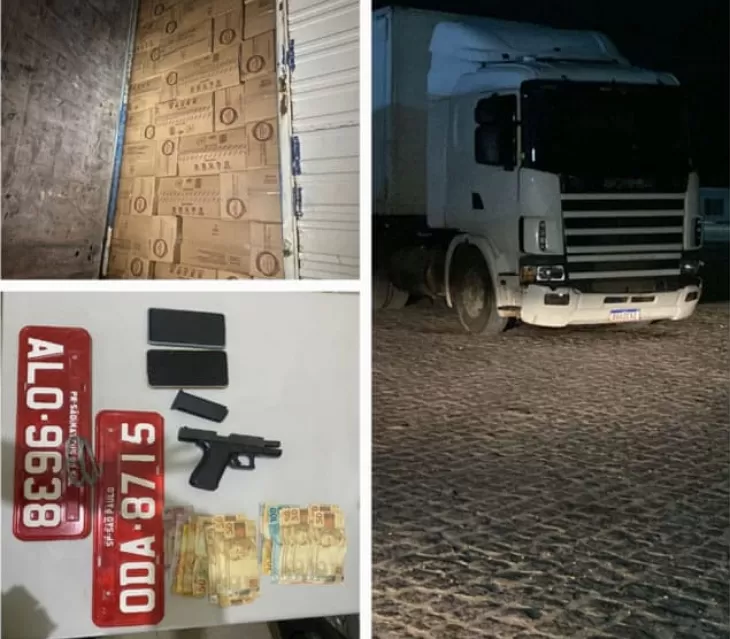 A equipe policial iniciou as buscas e localizou o veículo no pátio do posto Papacaça, às margens da rodovia PE-218. Dois homens, de 51 e 23 anos, foram presos em flagrante no local. Durante a abordagem, os policiais encontraram uma pistola dentro da cabine do caminhão, além de três placas falsas, um rádio comunicador e uma quantia em dinheiro.