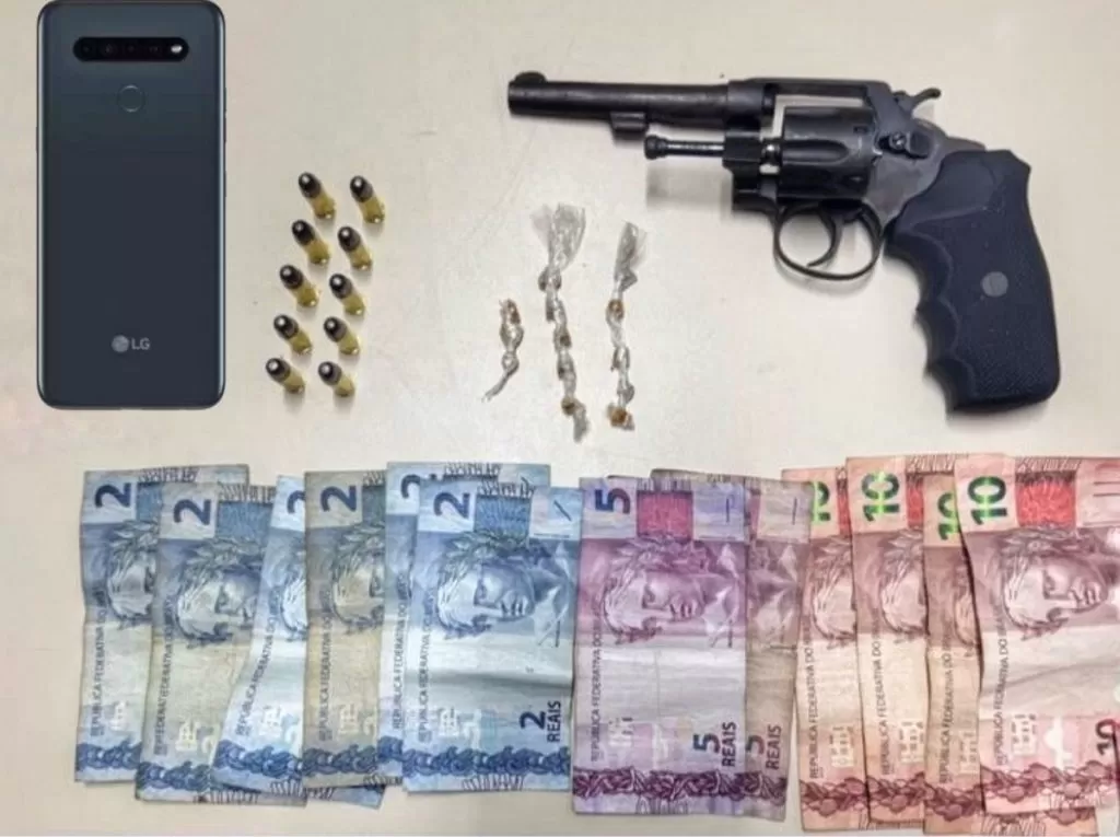 O suspeito, identificado como Bruno Ricardo Souza da Silva, foi abordado pelos policiais e flagrado portando uma arma de fogo, munições, drogas e uma quantia em dinheiro. De acordo com o relatório da polícia, Bruno estava com um revólver calibre 32, 10 munições, 13 pedras de crack, um celular e R$ 67 em espécie.