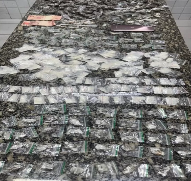 Ao chegarem, os PMs avistaram dois indivíduos que, ao perceberem a presença policial, se separaram. Ambos foram abordados e, com um deles, foram encontradas 11 pedras de substância análoga ao crack e R$ 20,00 em espécie. Com o outro indivíduo, foram localizadas 19 pedras de substância similar ao crack e um celular que constava como produto de roubo no sistema da Polícia Ágil.