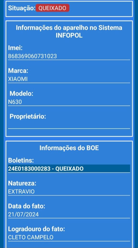 Os PMS obteve êxito na recuperação de mais um aparelho de celular com queixa de roubo, ao solicitar o número de identificação (IMEI) do aparelho de marca Xiaomi Redmi 13C, (imei: 868369060731023 ) em posse de uma mulher D.S, foi constatado restrição para roubo/furto.
