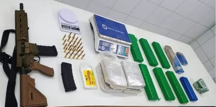 Foi levantado que os suspeitos estavam nas proximidades de uma residência e a equipe os encontrou no quintal da casa. Com eles, foram apreendidos um fuzil calibre .556 com dois carregadores e 27 munições, 12kg de maconha e duas balanças de precisão.