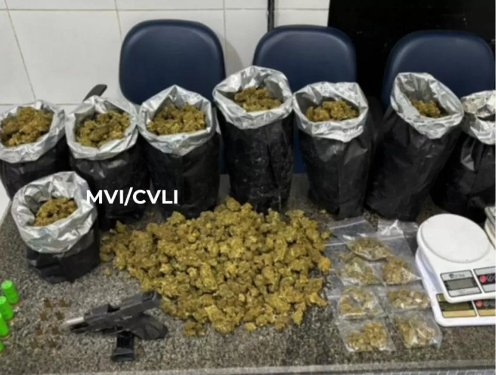 Com base em informações colhidas com populares, o efetivo chegou até o ponto indicado, onde foram localizadas uma pistola calibre .9mm com oito munições, oito munições de calibre 12, 4,6kg de maconha e outros sete zip locks da mesma droga e cinco balanças de precisão.