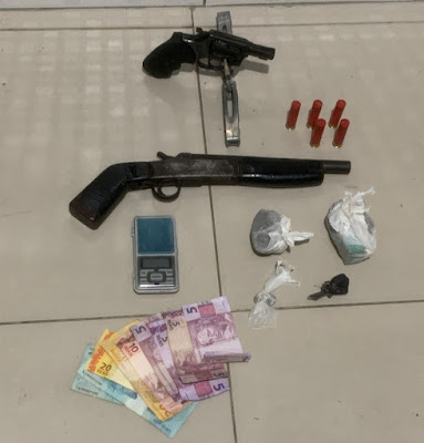 No momento da chegada do policiamento a mulher conseguiu se evadir e um de seus filhos foi preso. No local foram apreendidas: uma balança de precisão, duas armas de fogo, cinco munições intactas, 120g (cento e vinte gramas) de maconha e a quantia R$ 270,00 (duzentos e setenta reais).