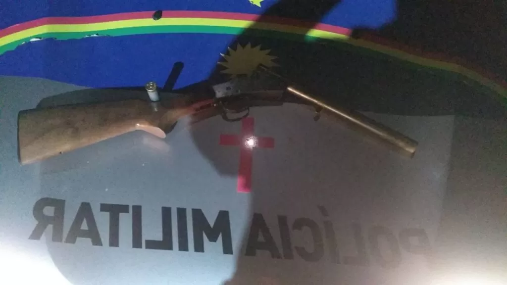 A equipe policial realizou buscas na região e conseguiu localizar o suspeito, que apresentava escoriações no corpo. Questionado sobre o ocorrido, ele afirmou ter se ferido ao correr pela vegetação e confessou que portava uma arma para sua segurança. A espingarda calibre 12, com duas munições (uma intacta e outra deflagrada), foi encontrada nos fundos do terreno da residência.