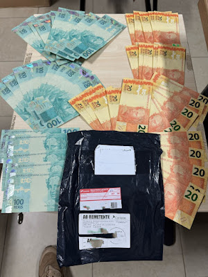 A Polícia Federal prendeu em flagrante, na última terça-feira (01/04), por volta das 15h, um marceneiro, de 21 anos, natural de Recife/PE e residente em Prazeres-PE, o qual havia acabado de receber na Agência dos Correios de Prazeres-PE, uma encomenda postal contendo 25 (vinte e cinco) cédulas falsas de R$ 100 reais e 25 (vinte e cinco) cédulas falsas de R$ 20 reais, totalizando R$ 3.000 (três mil reais) falsos. Ao receber informações sobre o envio de remessa suspeita de conter cédulas falsas, policiais federais monitoraram a entrega. O marceneiro foi abordado pela equipe policial ao sair da agência dos Correios, quando recebeu a encomenda, momento em que foi solicitado a sua abertura, confirmando no seu interior as cédulas falsas.